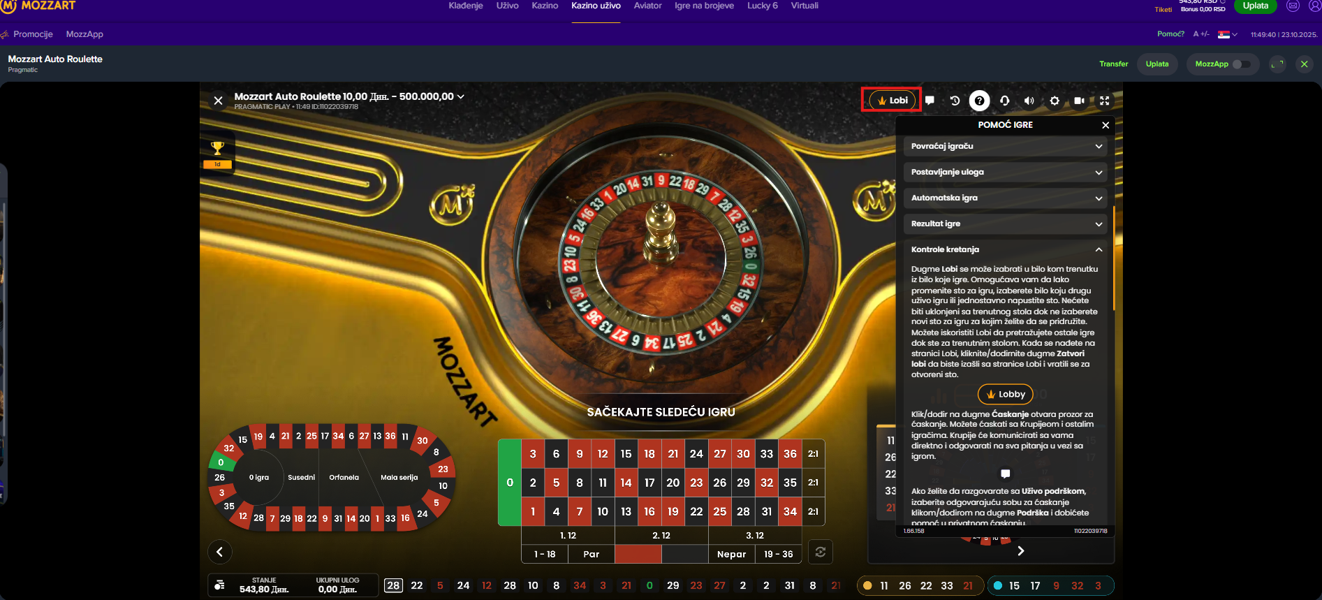 Dugme “Lobi” možete izabrati u bilo kom trenutku iz bilo koje igre. Omogućava Vam da lako promenite sto za igru, izaberete bilo koju drugu uživo igru ili jednostavno napustite sto. Nećete biti ukljonjeni sa trenutnog stola dok ne izaberete novi sto za igru za kojim želite da se pridružite. Možete iskoristiti “Lobi” da pretražujete ostale igre dok ste za trenutnim stolom. Kada se nađete na stranici Lobi, odaberite dugme “Zatvori lobi” da biste izašli sa stranice “Lobi” i vratili se za otvoreni sto.