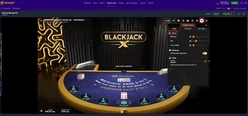 Kada pristupite Kazino igri na opciji “Podešavanja” u gornjem desnom uglu, imate mogućnost da podesite zvuk.