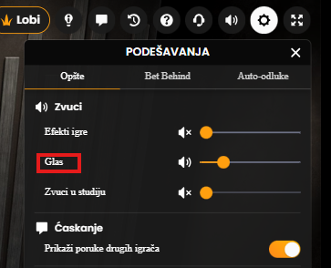 Glas krupijea možete isključiti tako što isključite opciju Glas. Takođe, možete podešavati jačinu zvuka i zvučnih efekata.