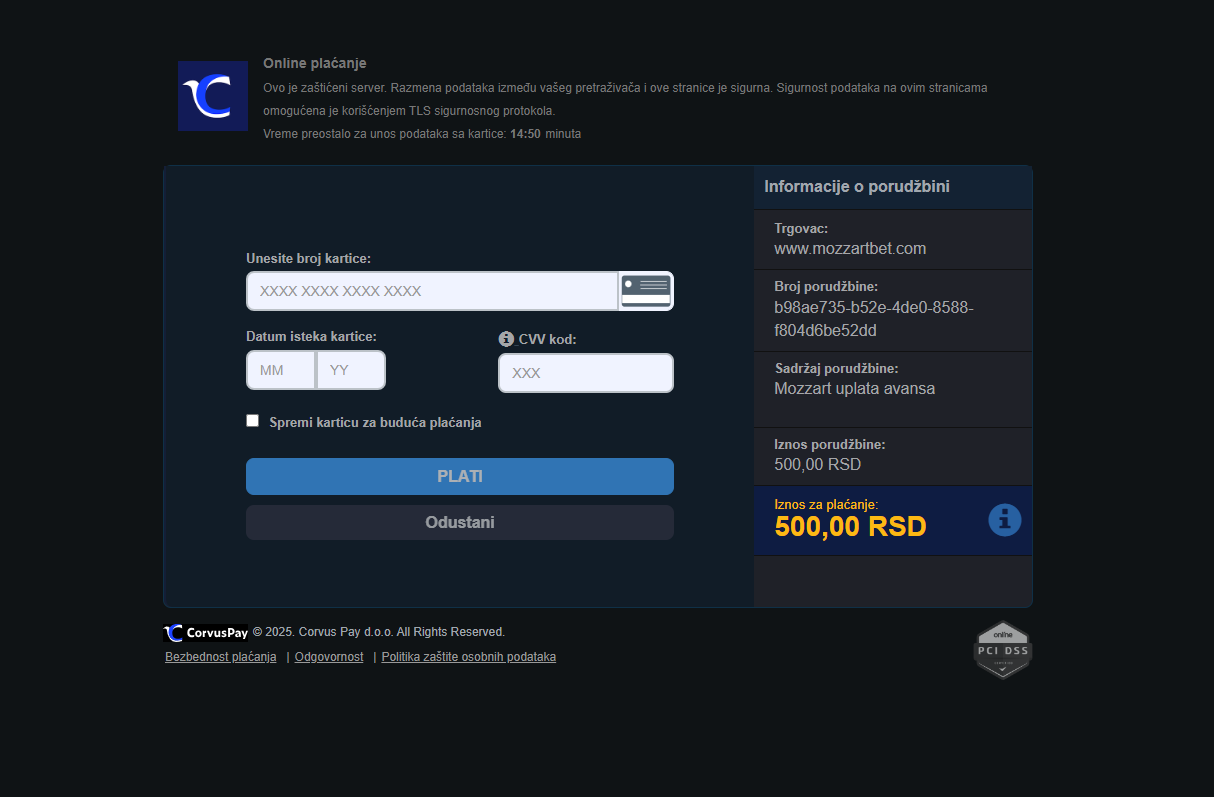 Nakon ovog koraka sistem će vas preusmeriti na prozor za plaćanje, koji izgleda ovako: