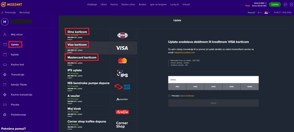 Kada izaberete željenu vrstu kartice, otvoriće vam se novi prozor gde je potrebno da unesete iznos koji želite da uplatite na svoj nalog. Minimalni iznos uplate je 500 RSD.